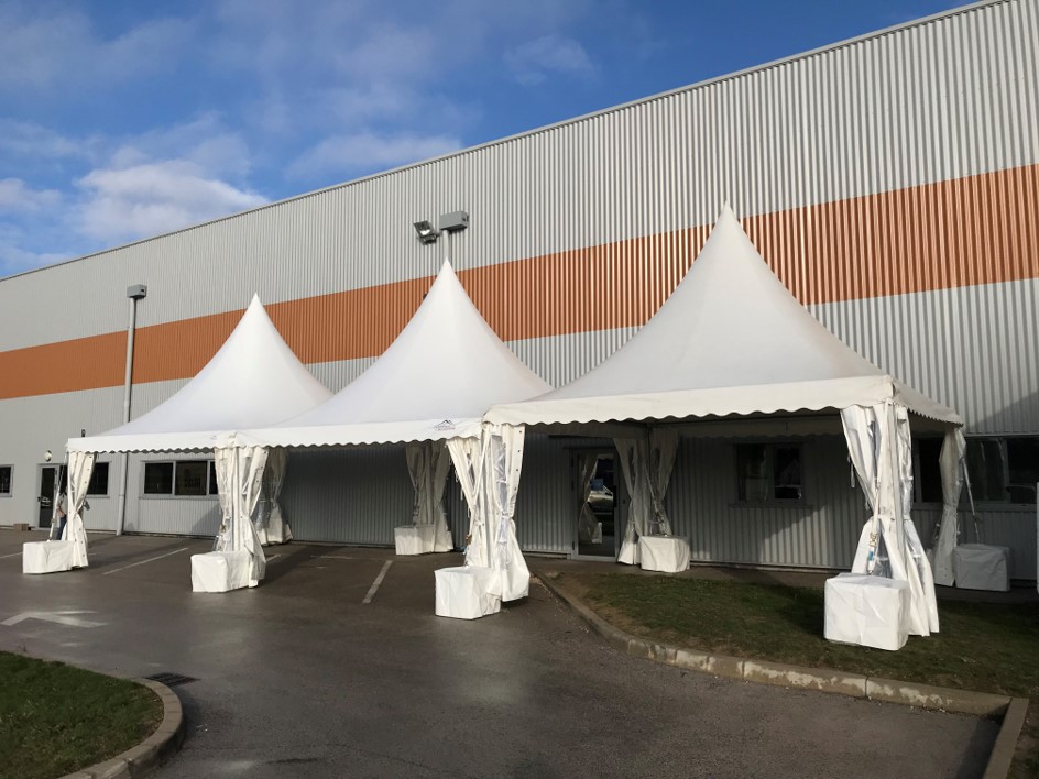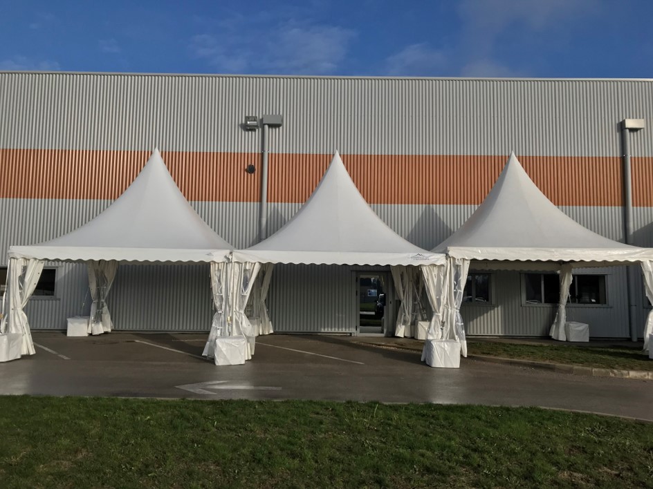Pour les fêtes de fin d’année, la fromagerie Delin à Gilly les Citeaux a souhaité installer 3 tentes GARDEN de 5x5m accolées pour augmenter la surface de vente du magasin. Ces barnums ont été lesté par des plots en béton .