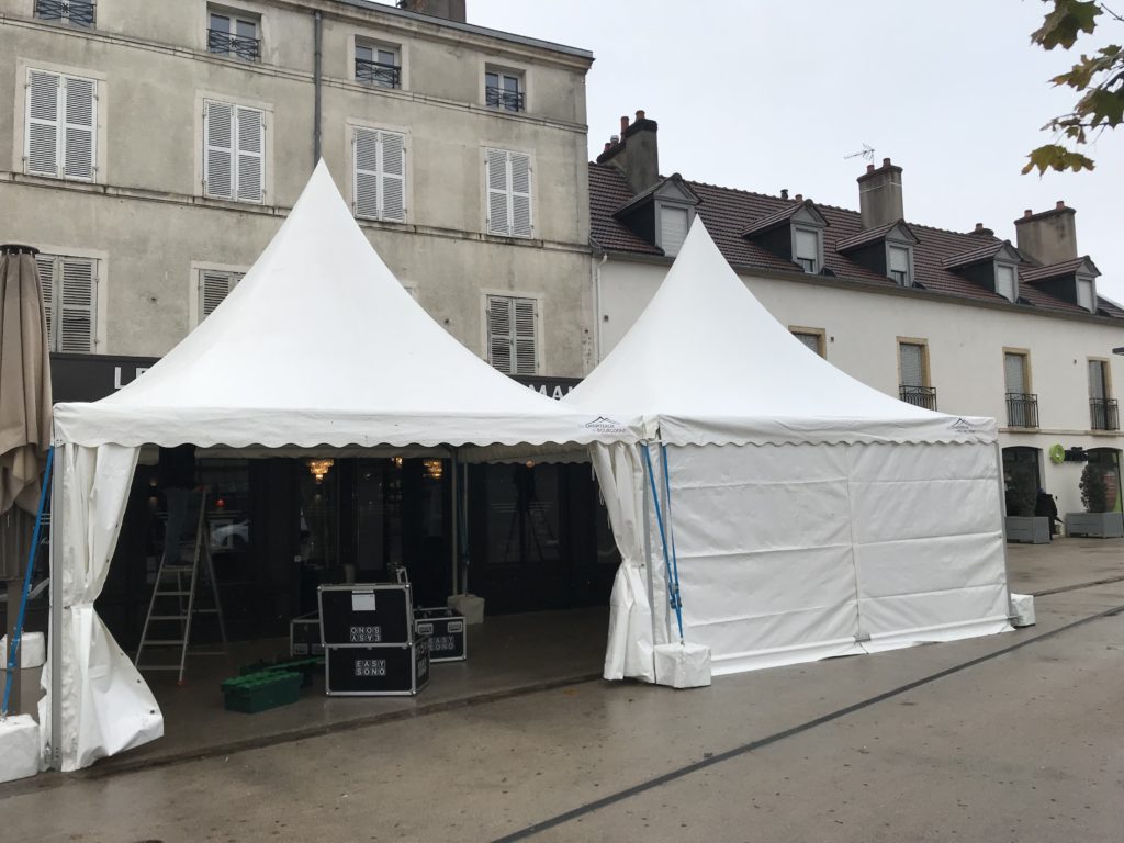 Installation de 2 tentes GARDEN 5x5m lestées devant l’établissement pour abriter un bar extérieur et augmenter la capacité admissible de l’événement.
